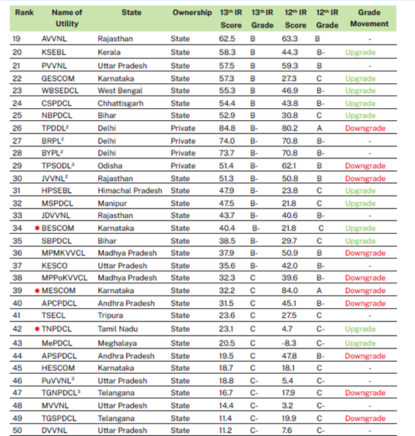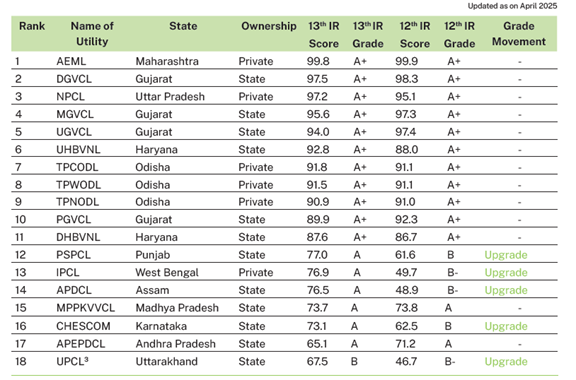 - Rating movement: 21 utilities upgraded their ratings vs previous year and 23 DISCOMs showed an ‘improving’ trajectory (>5% score gain).
