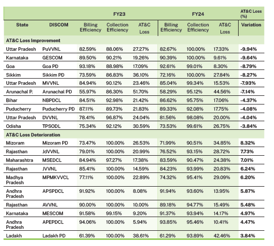 - AT&C loss improvers (big reductions FY23→FY24): PuVVNL (UP), GESCOM (Karnataka), Goa PD, Sikkim PD, MVVNL (UP), Arunachal PD — some saw >7–9 ppt drop in AT&C losses.
