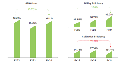 - Collection efficiency: Slight decline to 96.51% (FY24) — this is the weak link behind the AT&C uptick.